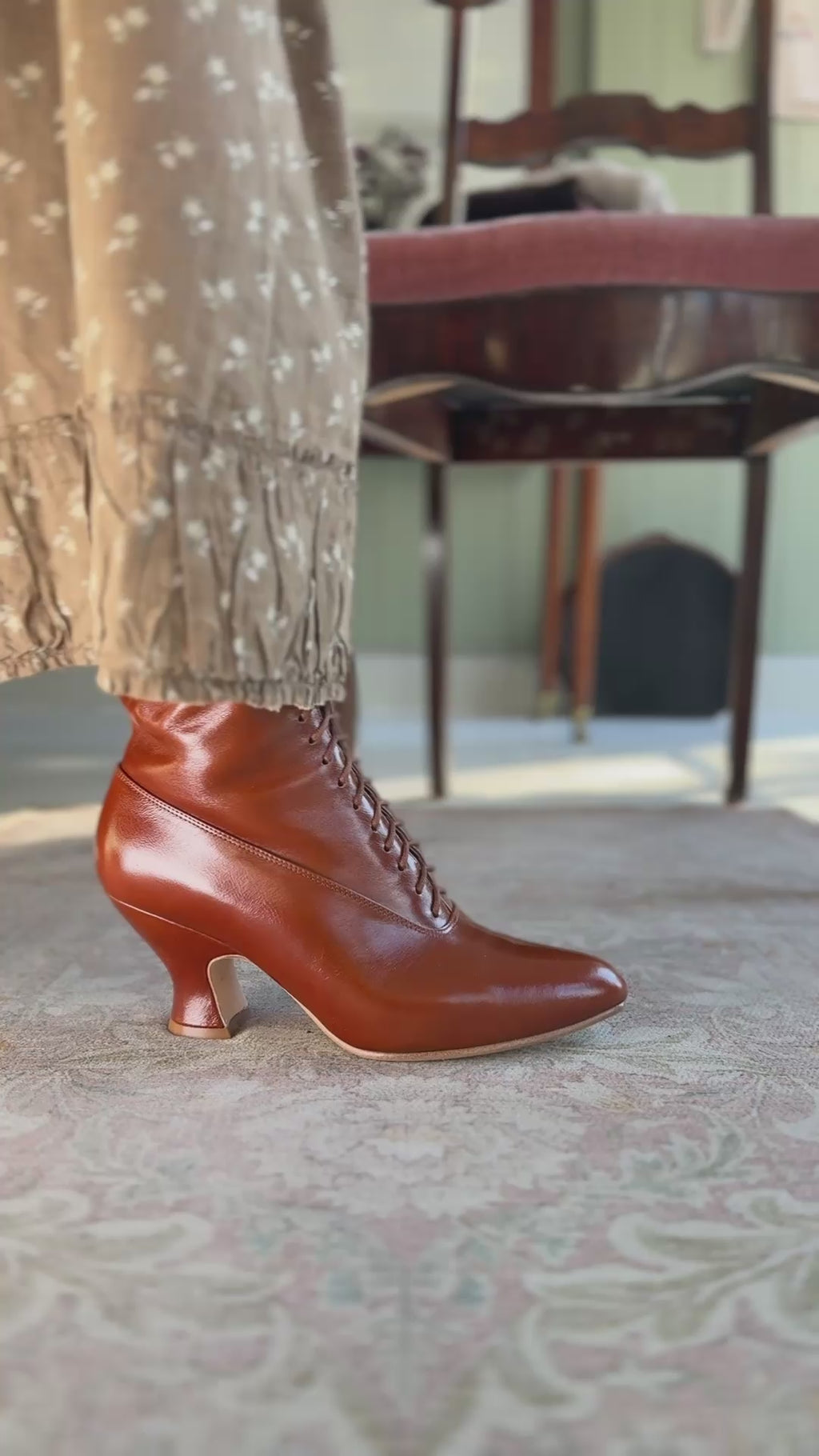 Feminine soft Edwardian style boot with pompadour heel, 1900-1915 - Cognac brown - Rose