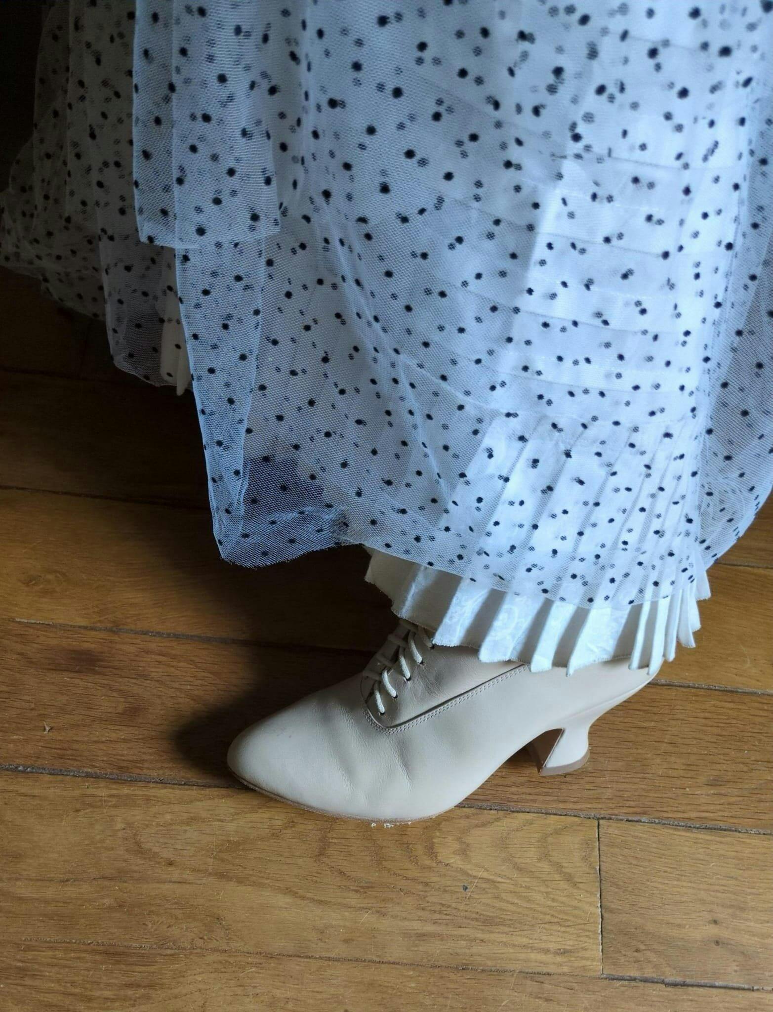 This stylish Edwardian boot features a pointed toe for a close fit and a French pompadour heel crafted to be 100% faithful to the Edwardian design. Boasting a height of 7 cm, the heel is perfectly balanced for effortless walking. Crafted from leather with a cream-white canvas lining, inner silicone inserts provide exceptional comfort. Long cotton shoe laces and delicately placed metal eyelets adorn the inside for a truly timeless look.