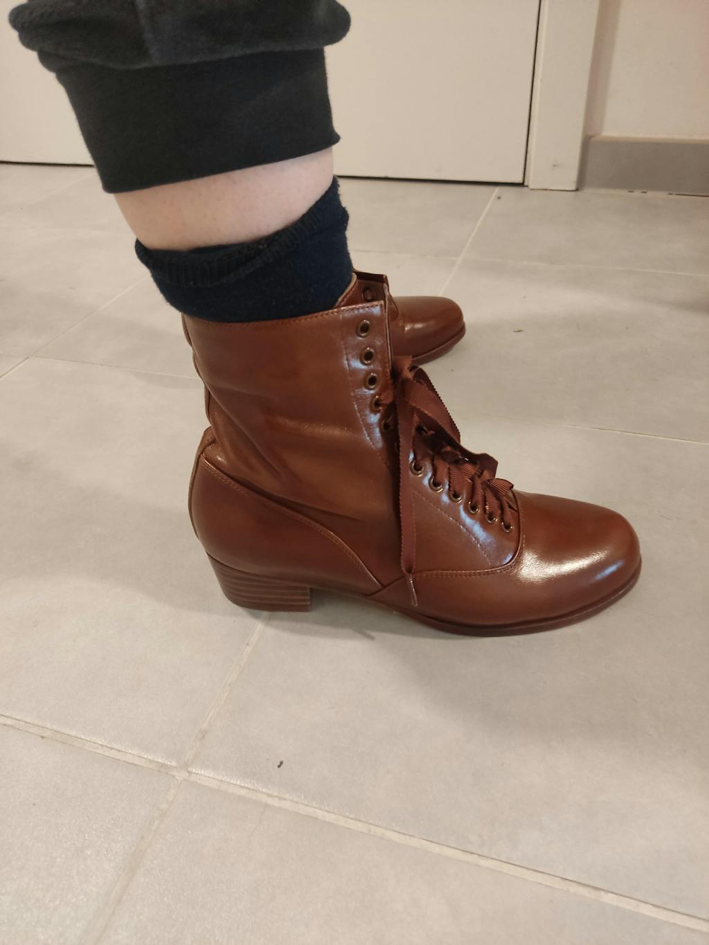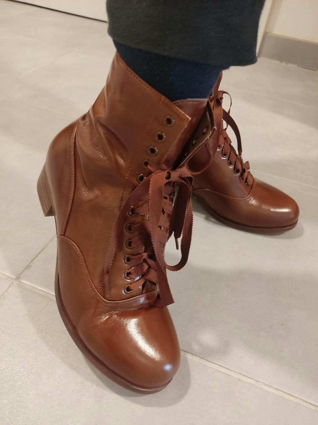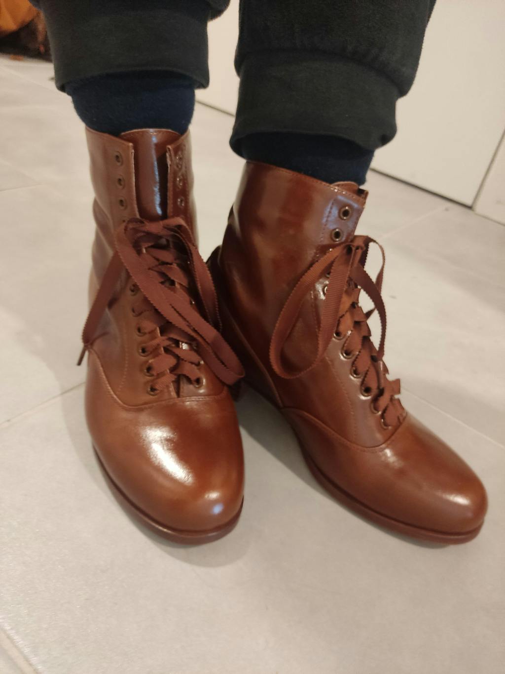 Featuring a spacious, round toe and a 3.5 cm high heel, the shape and height of the heel offer optimal comfort and stability. The boots, which feature wide ribbon shoelaces, have leather soles and a soft sheep leather insole—genuine to the original boots of this period.