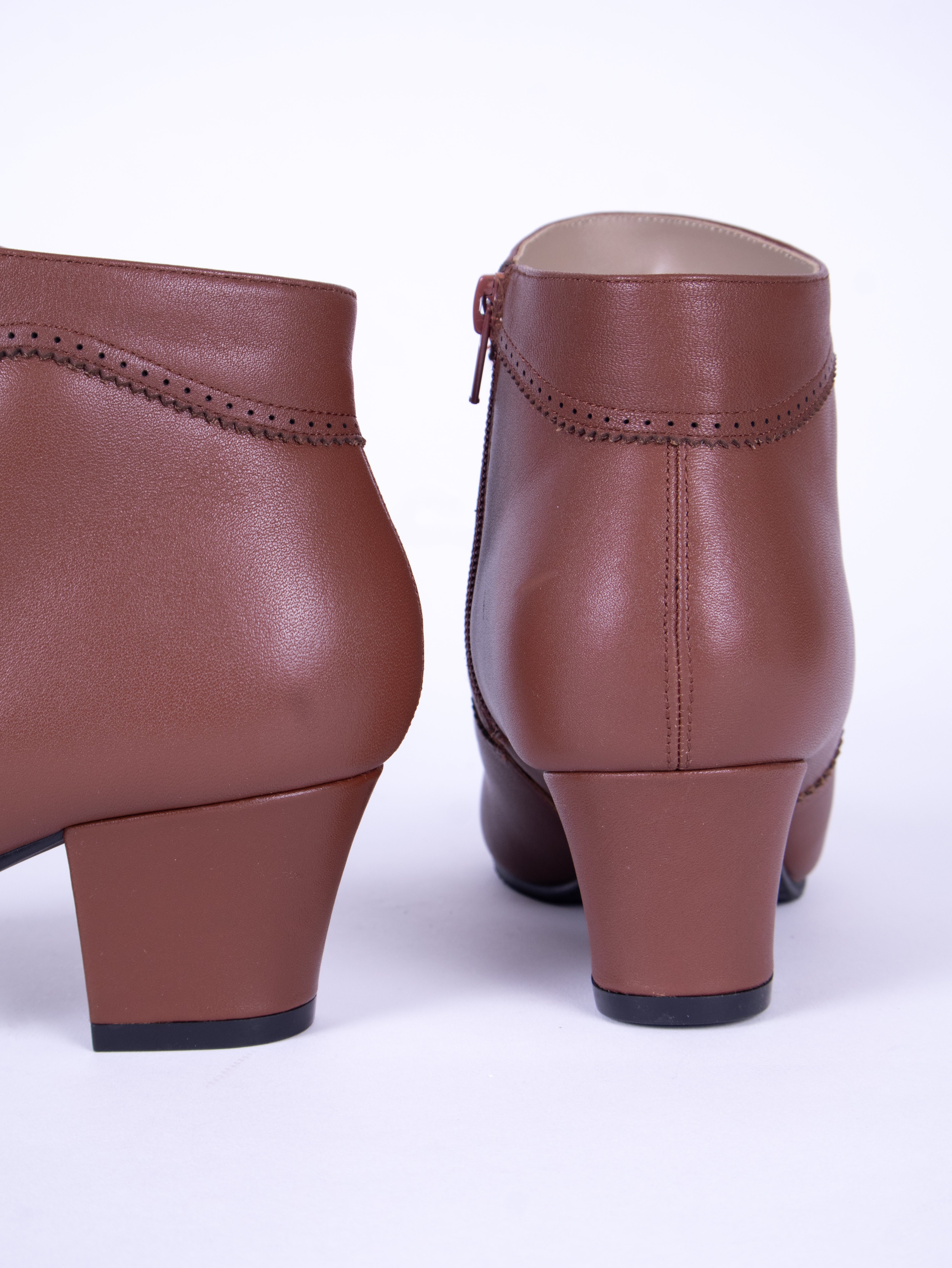 The boot features a rounded, spacious toe cap, decorative brogue detailing, and a slim-fitting short boot shaft. For easy fastening, the boot has a metal zipper on the inner side. The sturdy, slightly curved, medium-high heel and the short, close-fitting shaft give the boots an elegant, sophisticated look.