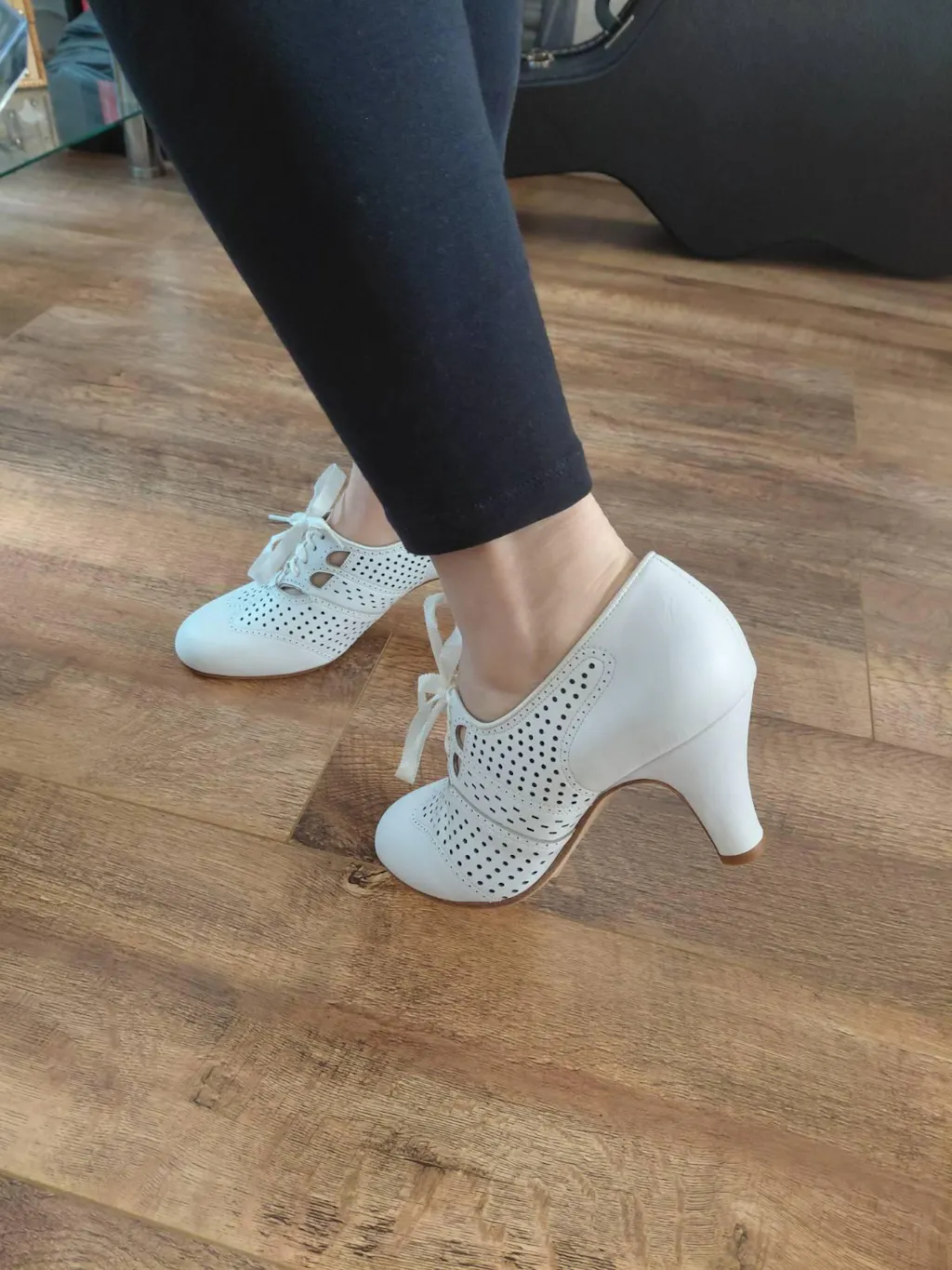This everyday Oxford high heel combines vintage elegance with modern comfort. Featuring an ultra-feminine, medium-height Spanish heel, it exudes the charm of the early 1930s. The iconic cut-out and perforation pattern adds a distinct 30s touch, while wide grosgrain ribbon laces and edges complete the look with timeless sophistication.