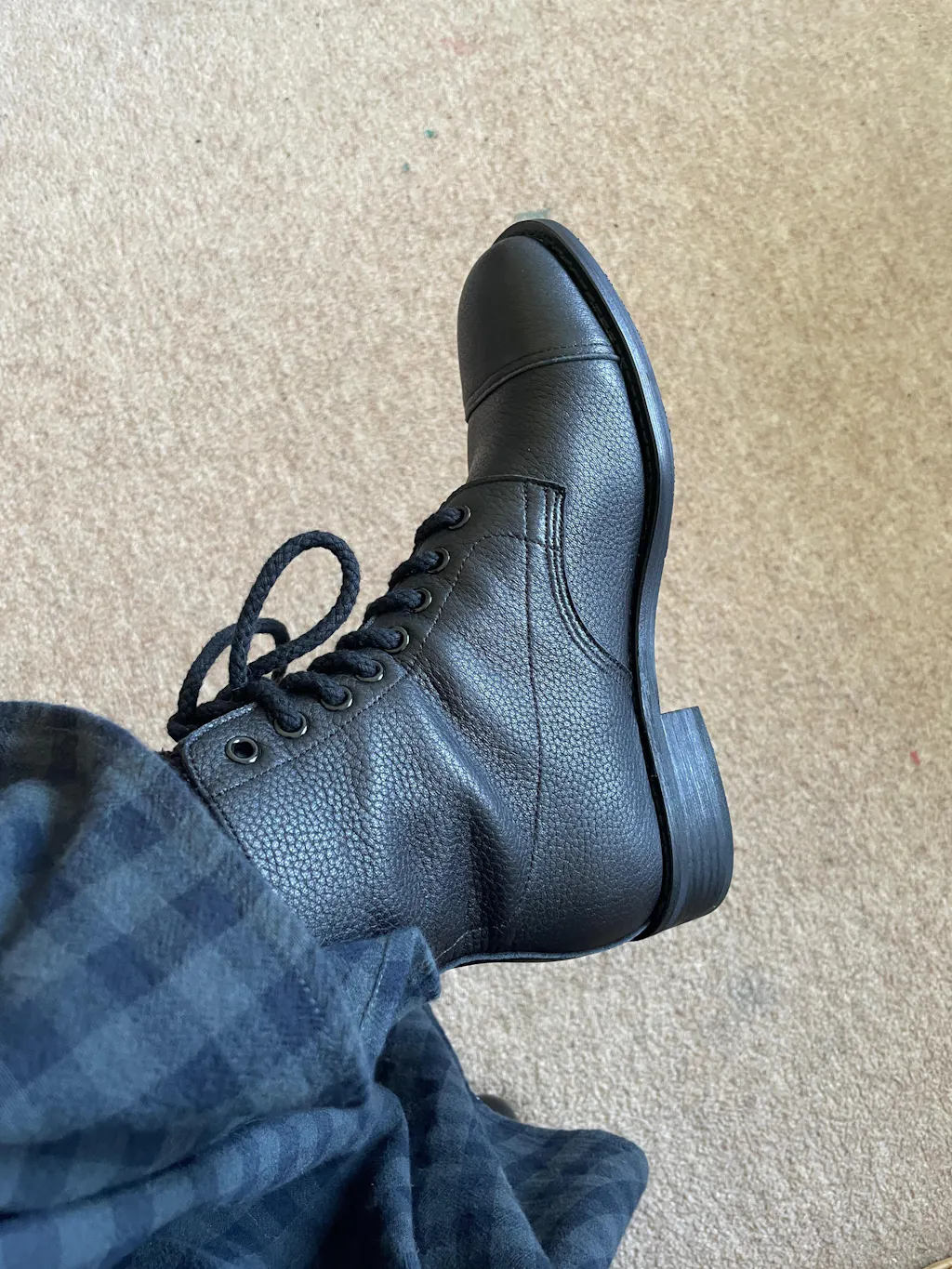 Introducing Robbie, an authentic-looking WWII 1940s-inspired leather lace-up boot. These sturdy, casual boots are crafted from full-grain structured leather and feature a rounded toe cap, a slim-fitting boot shaft, eight pairs of metal eyelets for the laces, and durable rubber outsoles.